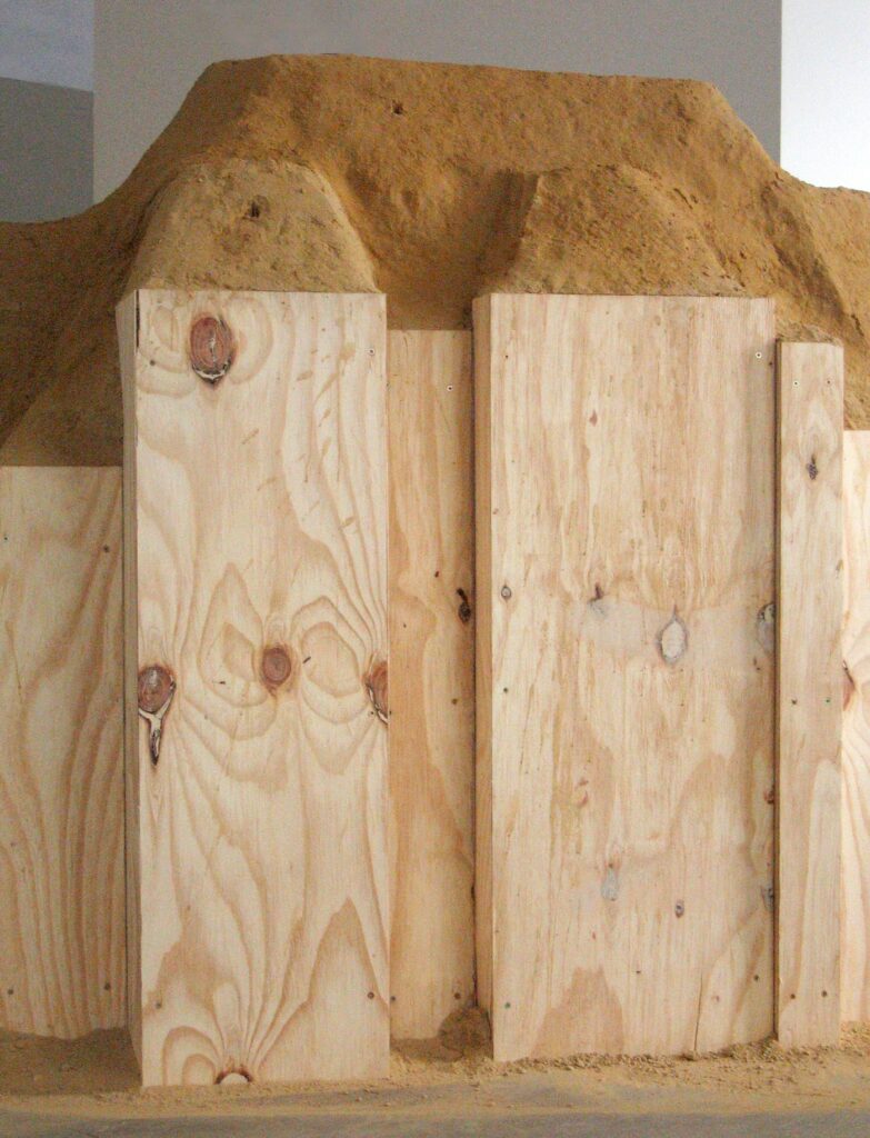 Installation made of sand and plywood, referring to Luxembourg’s fortress and its constant physical and signification changes throughout history. Evocative of children’s sand castles, the work also alludes to my personal history in this country.